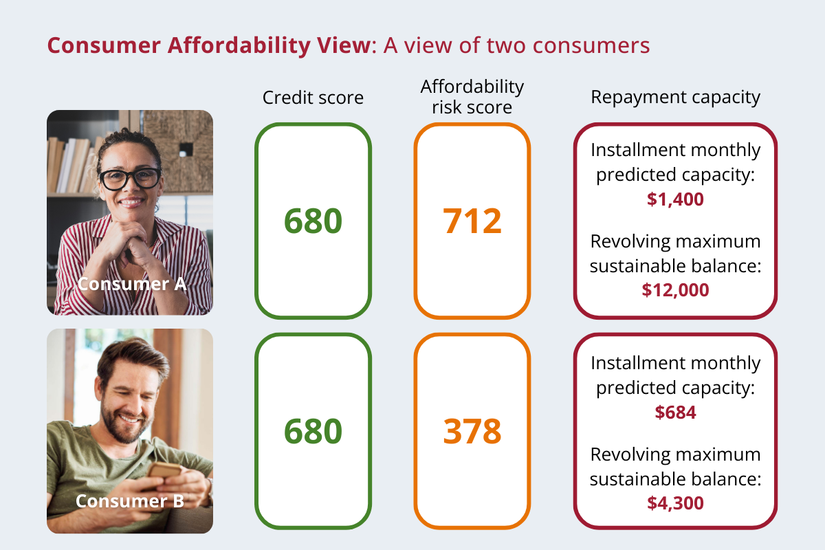 Consumer Affordability View delivers a rank‑ordered affordability measure paired with dollar‑based monthly repayment estimates for both installment and revolving credit. When used alongside a traditional credit risk score, it adds critical context—helping differentiate borrowers within the same score band, identify over‑leveraged consumers, and uncover applicants with the capacity to take on more credit.